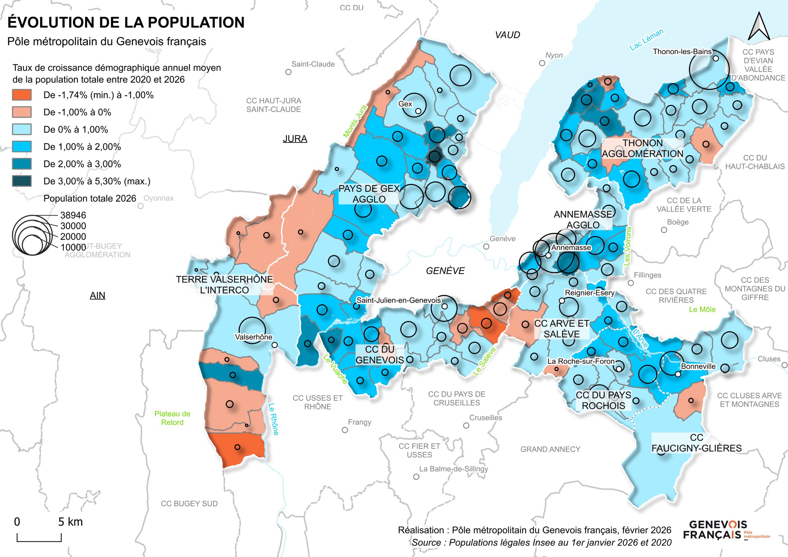 Les trois EPCI les plus peuplés restent le Pays de Gex Agglo, Thonon Agglomération et Annemasse Agglo. À eux seuls, ils concentrent 67% de la croissance démographique, confirmant un desserrement de l’accueil de population vers des territoires plus périphériques.