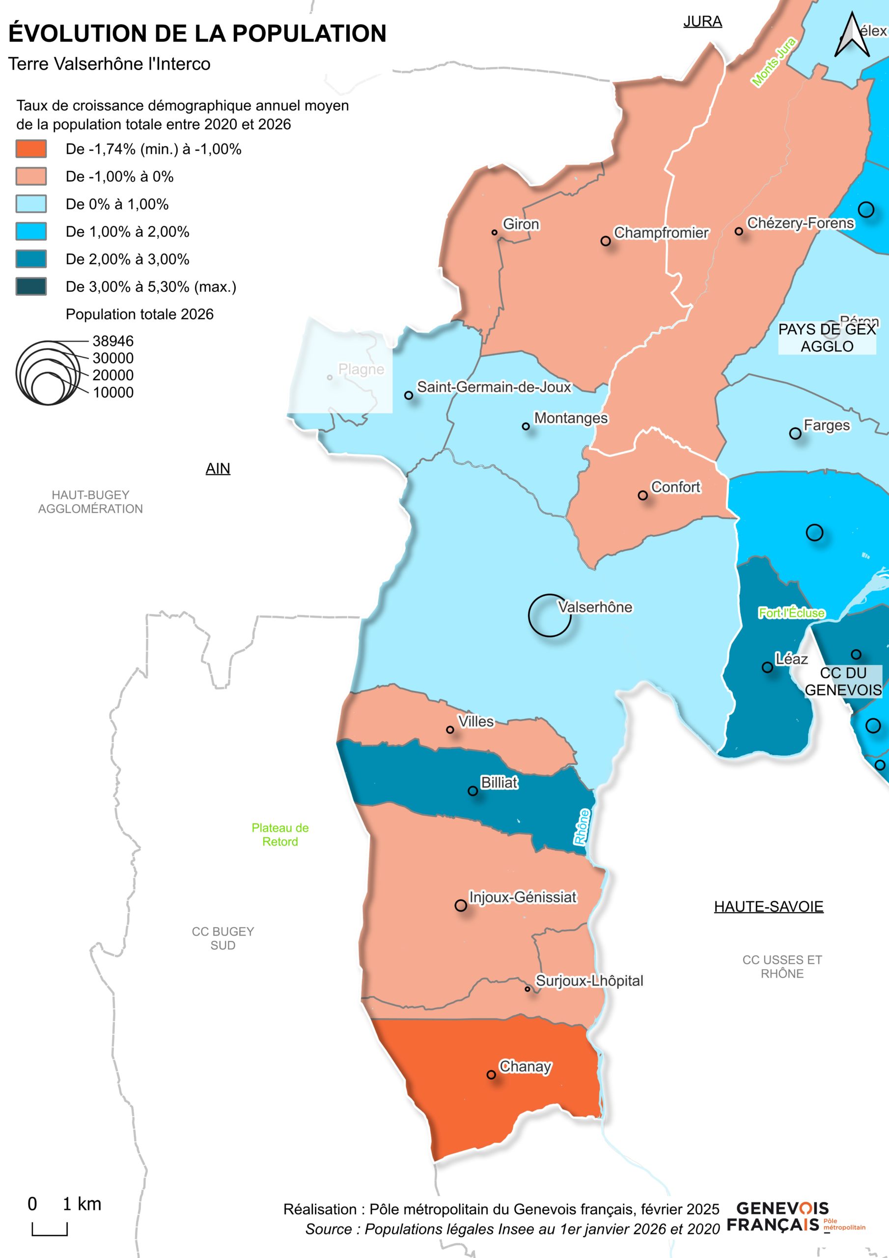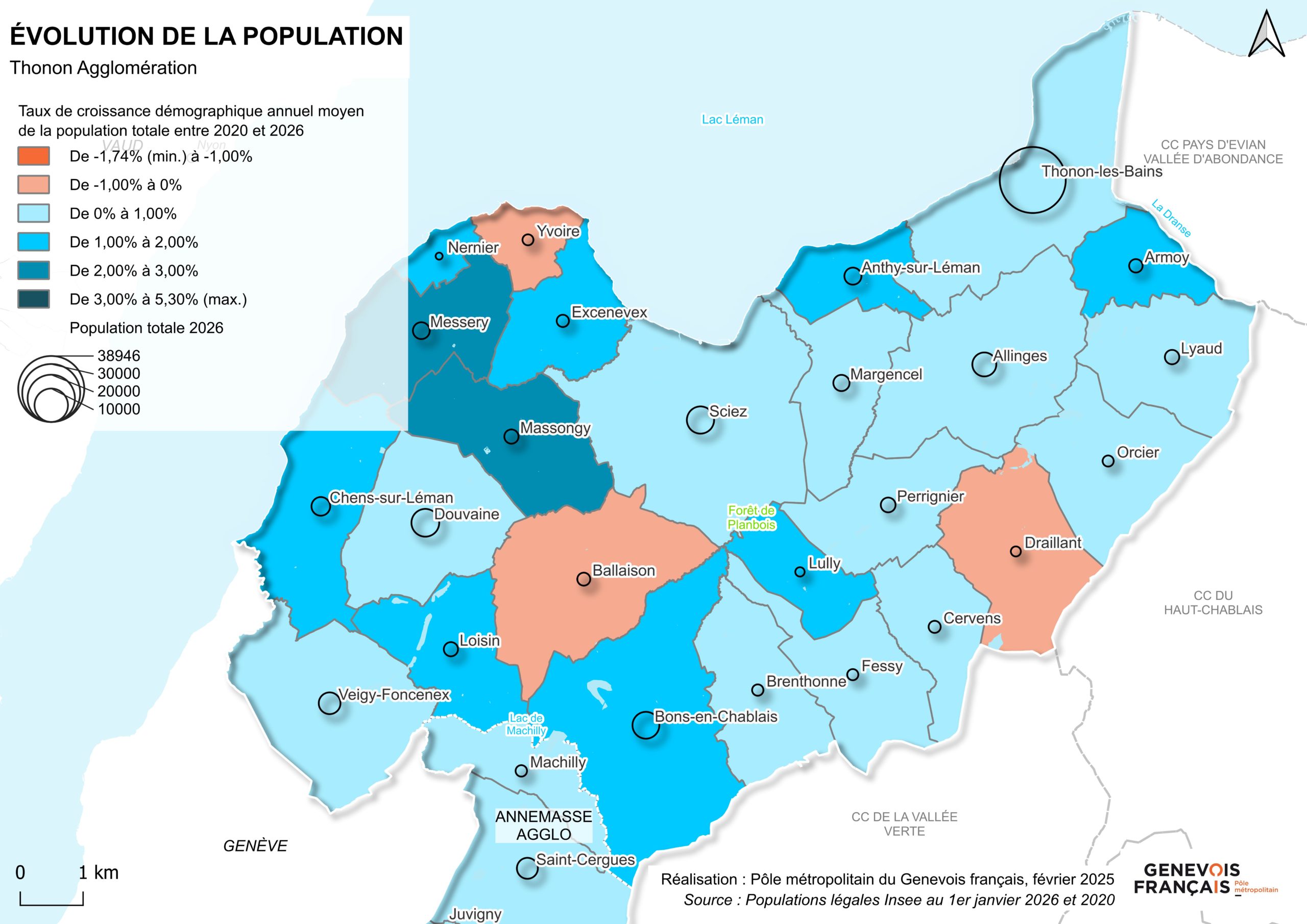 Côté communes, Thonon-les-Bains reste la plus peuplée, devant Annemasse et Valserhône, qui enregistre une forte progression avec +568 habitants en un an.